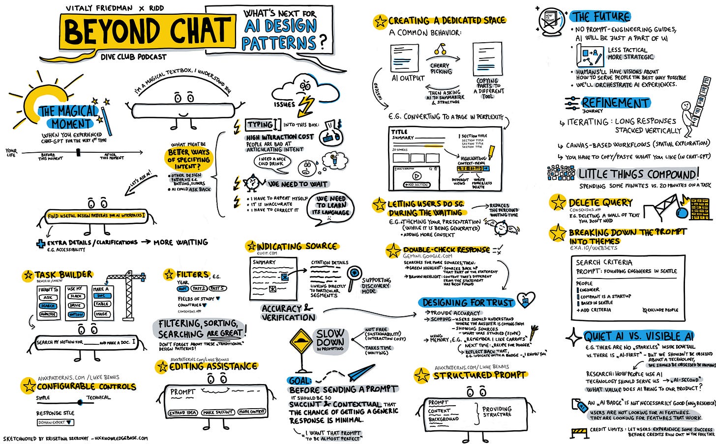 Here is my sketchnote of my all time favorite episode of the Dive Club podcast: Beyond Chat: What’s Next for AI Design Patterns — Vitaly Friedman & Michael Riddering explore how might we help users specify intent better.