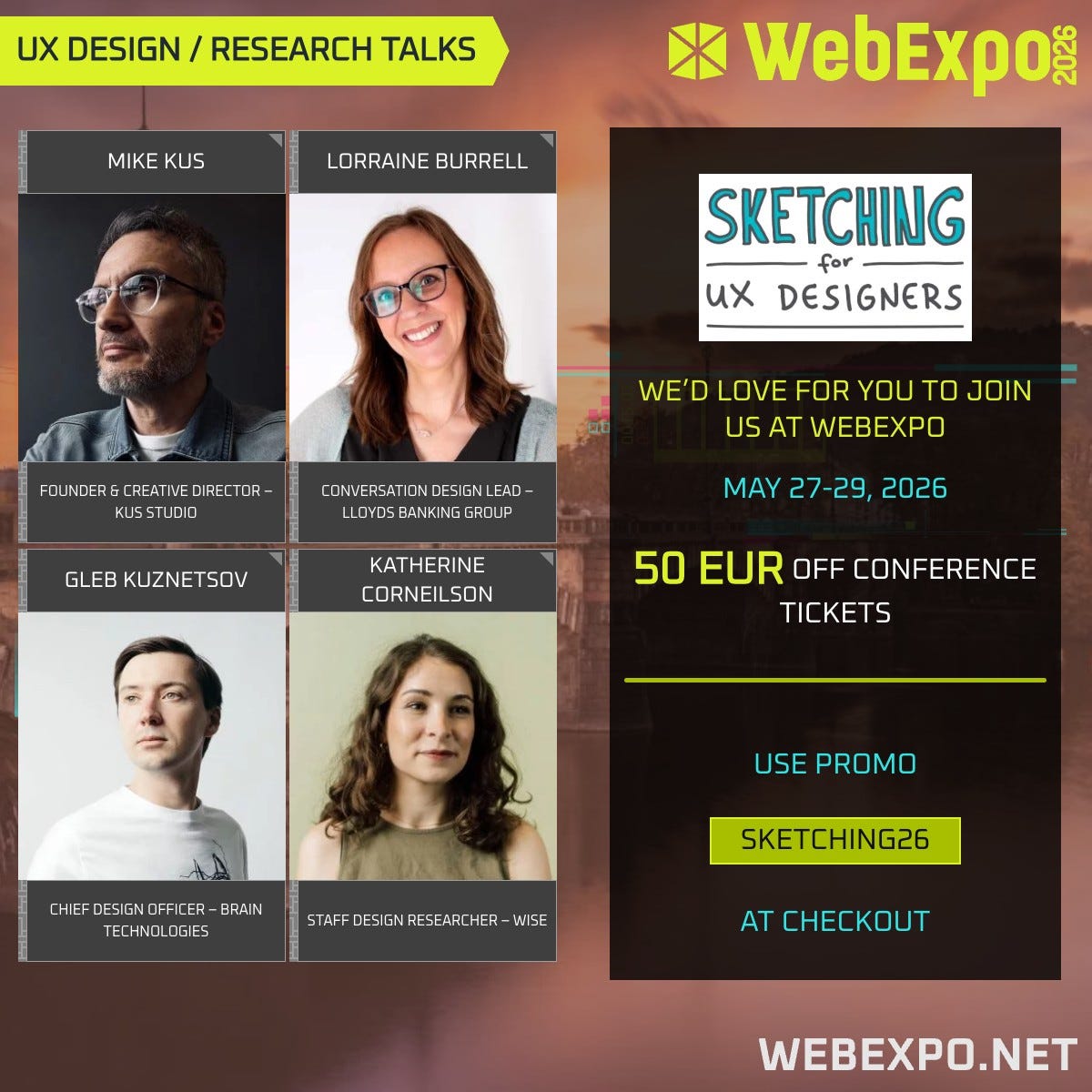 My favorite conference is back! WebExpo is the best event for web professionals. Use my code SKETCHING26 to get 50 EUR off Conference tickets (May 27 & 28) and Bundles (Conference + Workshop).