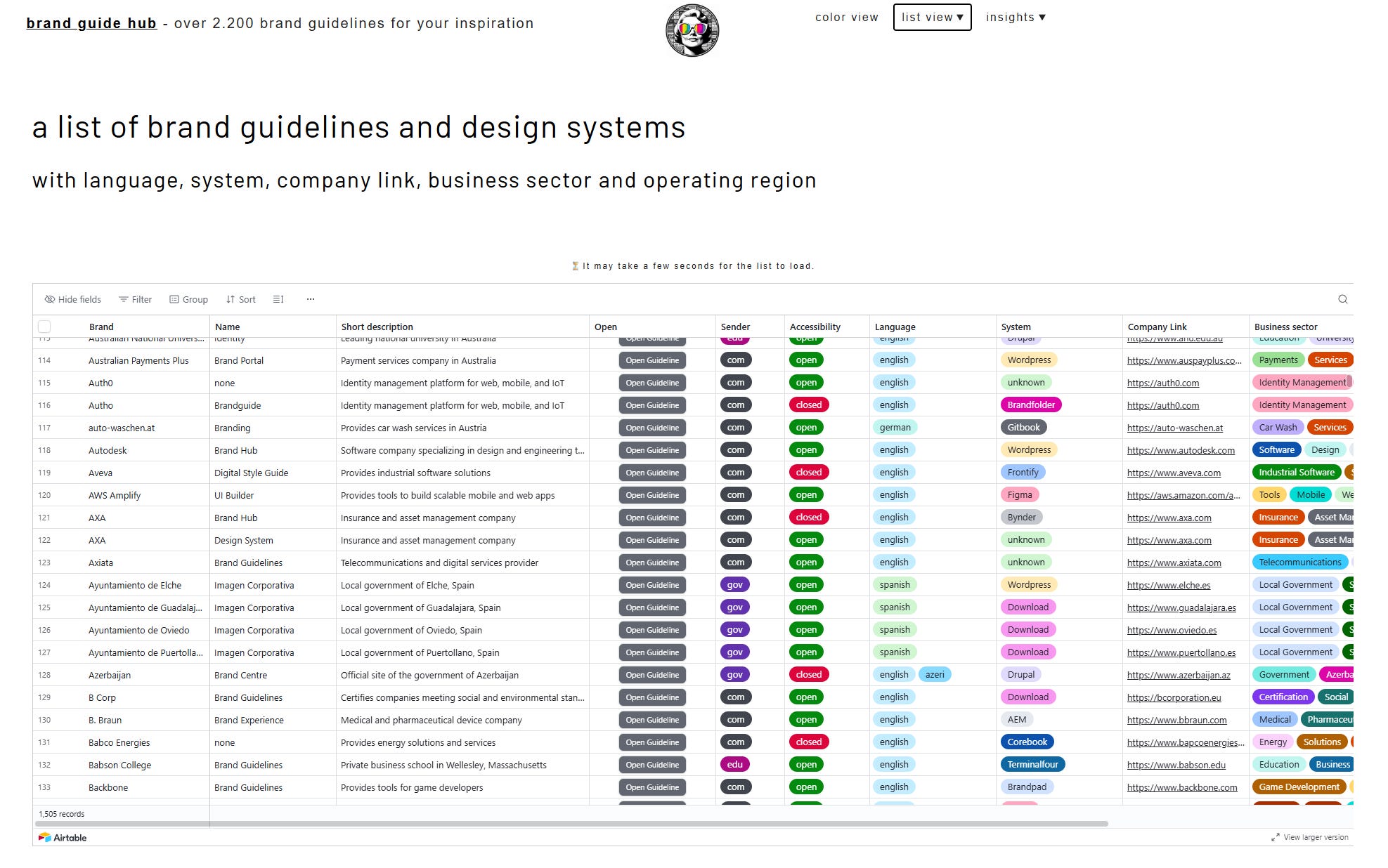 A list of brand guidelines and design systems with language, system, company link, business sector and operating region