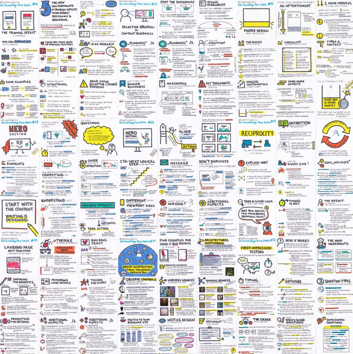 Back in 2017, I started the UX Knowledge Base Sketches series. After the release of the 100th sketch, I changed the format to better fit Instagram’s carousel pattern (and I also liked how those 9 little sticky notes came together and formed a square-shaped design poster). I released the first one in 2020, and created 72 UX Knowledge Piece Sketches since then. These are the latest 9 put together: